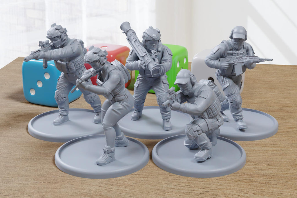 Wenn du die perfekte Elite-Einsatztruppe für deine postapokalyptischen oder Modern Warfare-Tabletop-Missionen zusammenstellst, sind diese detailreichen PMC-Operatoren sofort einsatzbereit! Dank ihrer dynamischen Posen – von präzisen Kampfstellungen bis hin zur schweren Unterstützung mit einem schultergestützten Raketenwerfer – bringt dieses Team kinoreife Action in jede Begegnung auf deinem Spieltisch.