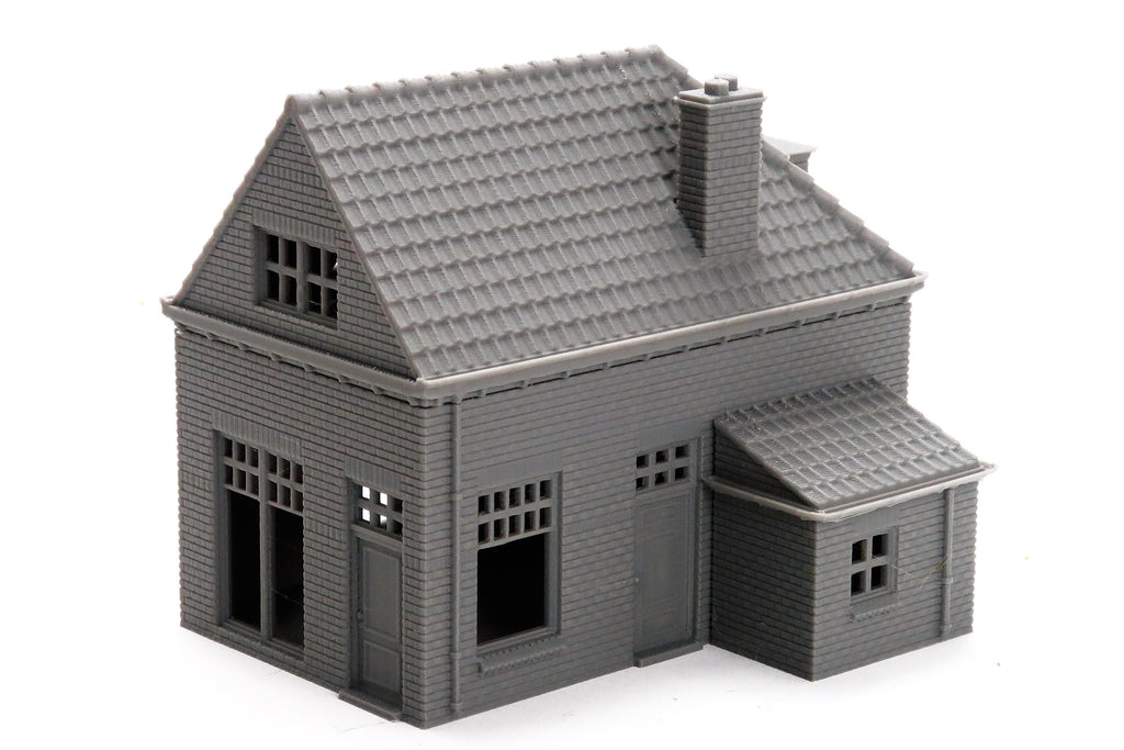 Dieses Gebäude ist auch im Maßstab 1:87 HO erhältlich, ideal für Modelleisenbahnsammler. Beachten Sie, dass die Struktur unbemalt geliefert wird.