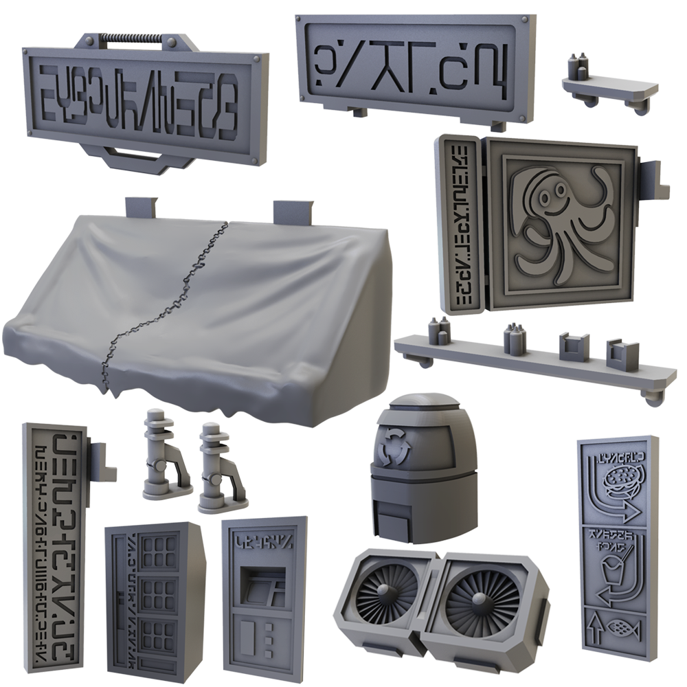 Mit Beschilderungen, Ausstellungseinheiten und Umweltrequisiten rufen diese Accessoires den düsteren Charme und das Unternehmenschaos einer Science-Fiction-Megastadt hervor – ideal für dystopische Scharmützel, Cyberpunk-Settings oder verlassene Sperrzonen.