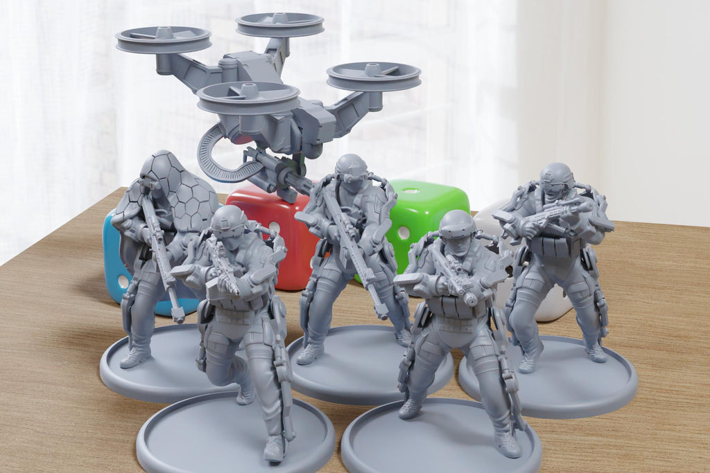 Contient 5 figurines miniatures et 5 socles (25 mm) ainsi qu'un grand drone.