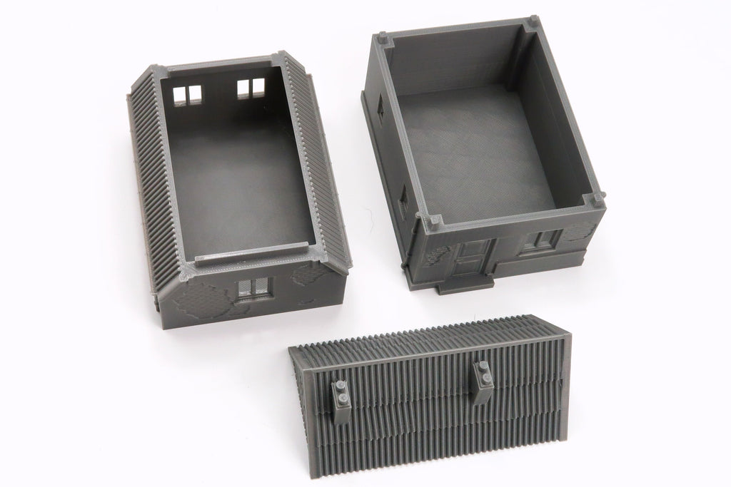 Tous les bâtiments sont livrés bruts, sans peinture ni apprêt. J'effectue le nettoyage, mais il est possible que quelques fines fibres subsistent. La couleur peut être grise ou noire. Chaque bâtiment est composé de sections empilables, comme illustré sur les images.