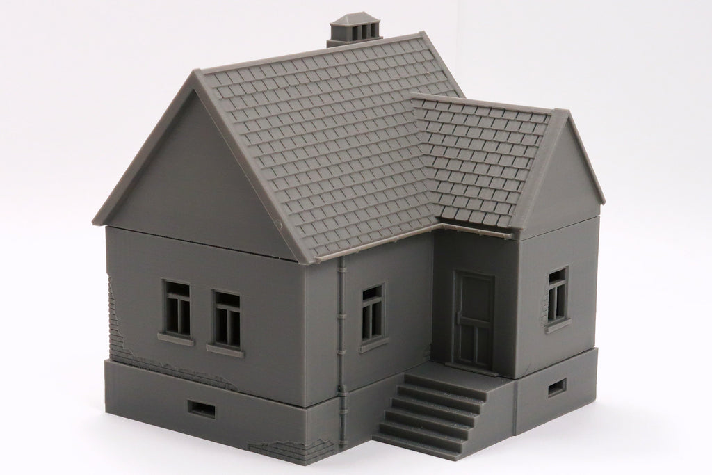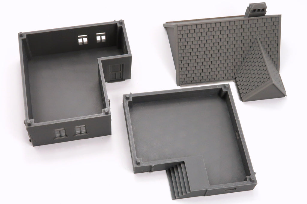 Tous les bâtiments sont livrés bruts, sans peinture ni apprêt. J'effectue le nettoyage, mais il est possible que quelques fines fibres subsistent. La couleur peut être grise ou noire. Chaque bâtiment est composé de sections empilables, comme illustré sur les images.