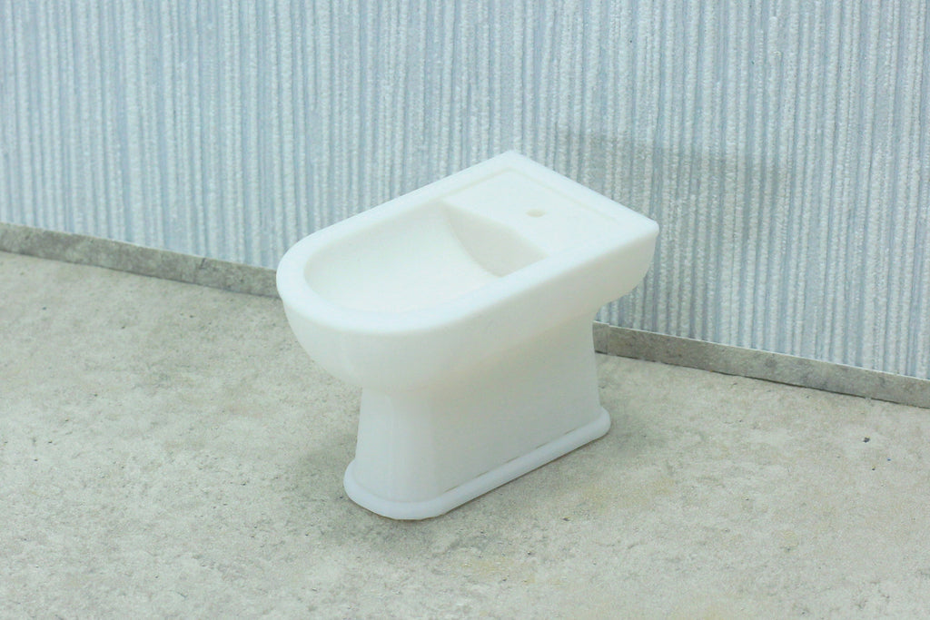 Add realism and sophistication to your dollhouse bathroom with this modern bidet, designed with smooth lines and clean geometry for a contemporary look. This miniature fits perfectly alongside other modern bathroom pieces such as the matching toilet and sink.