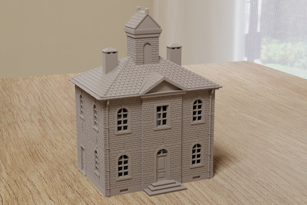 This model includes crisp brick textures, distinct window frames, and realistic roof tiles—ideal for painting and weathering to match your tabletop theme.