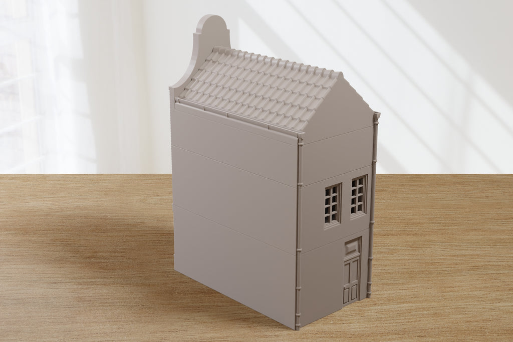 Bring a piece of the Netherlands to your tabletop with this detailed Dutch Canal Gable House, inspired by the classic architecture of cities like Amsterdam and Delft. Designed with care for miniature wargaming or model railroads, this building features a stepped gable façade, brick detailing, and traditionally styled windows and doors — ideal for adding authentic charm to any European urban layout.