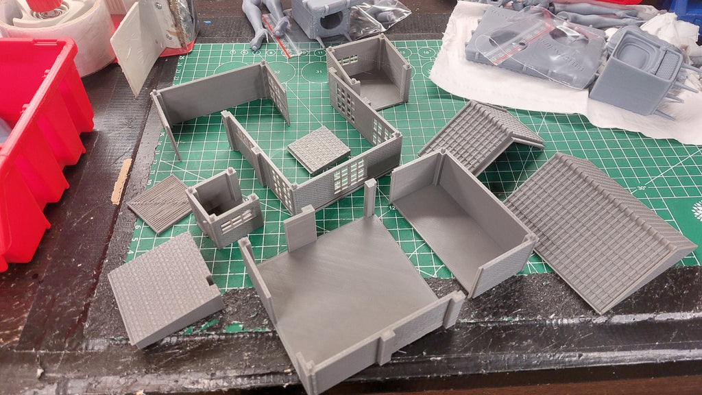 All buildings are unpainted and unprimed. I do the cleanup, but some tiny fibers may still be present. It may come in grey or black. Each building is created from stackable sections as shown in the images.