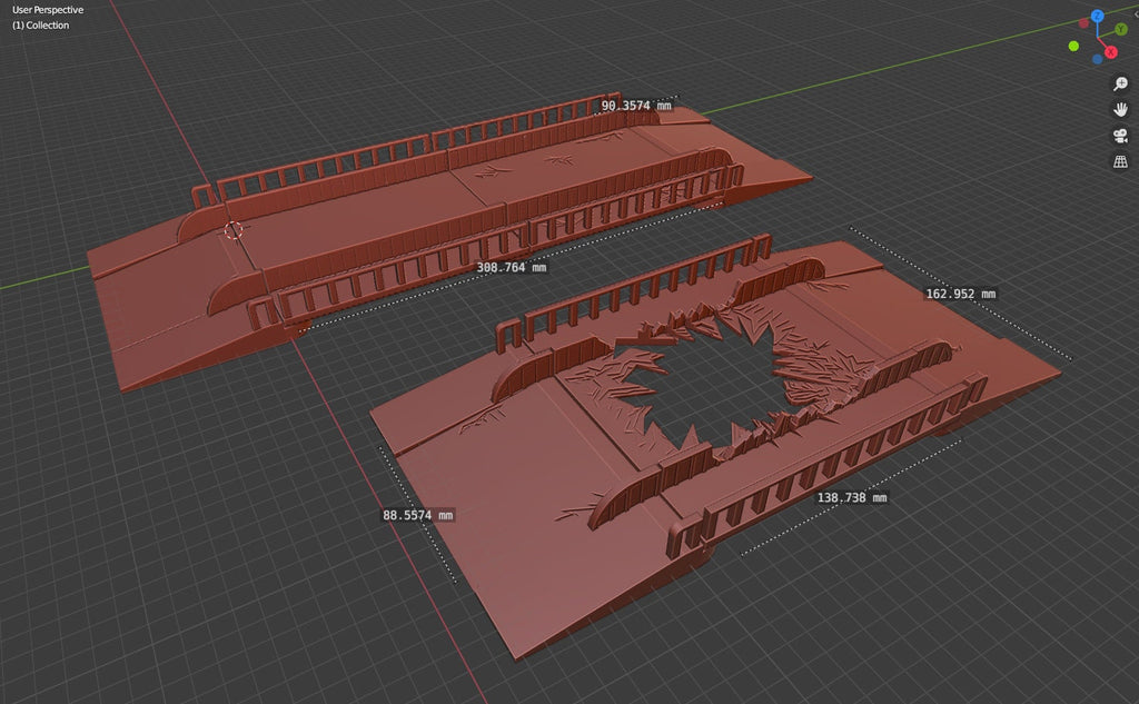 Dimensions, as shown in the last image with the red bridge, are for a 28mm (1/56) scale.