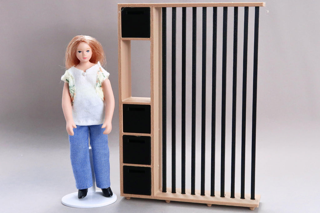 This modern room divider brings architectural style and function to your 1:12 scale dollhouse. Designed with a sleek slat wall and integrated shelves, it creates a sense of separation between spaces while keeping your dollhouse interior open and modern.