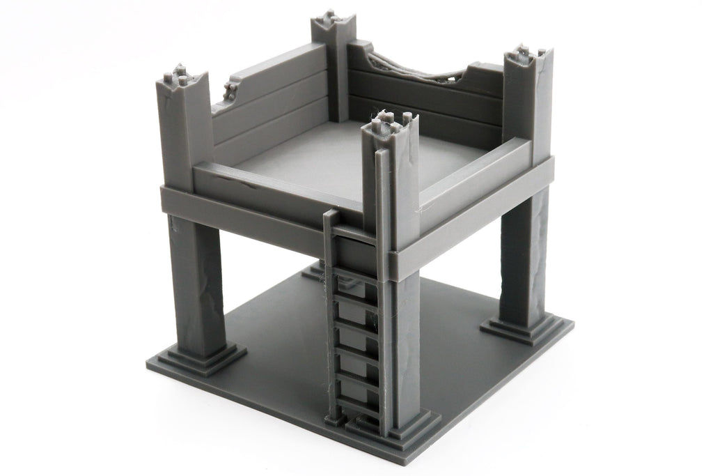 The design features a multi-level platform with a damaged upper floor, sturdy support pillars, and a functional ladder, allowing miniatures to take elevated positions for tactical gameplay. Vehicles or infantry can pass underneath the structure, making it both immersive and practical for dynamic scenarios.