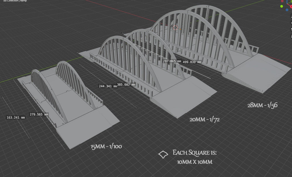 Dimensions, as shown in the third image with the red bridge, are for 28mm (1/56) scale. The bridge is a model kit and will require glue for assembly, each design is sold with parts to build one bridge only. There is an option to buy parts for all configurations but it comes only with two ramps. You can simulate each stage of its condition, Intact, Damaged, Destroyed.